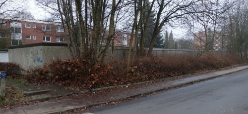 Die ersten Phantasien des Planers für diesen urbanen Bereich, auch wenn sie nur der vorläufigen Visualisierung dienten, waren ihnen zu massiv. Obwohl das Gebäude mit seinen insgesamt vier Geschossen niedriger bleiben sollte als der fünfgeschossige Bau dahinter und auch als der viereinhalbgeschossige große Wohnblock nördlich davon am Diekskamp, möchten SPD und CDU hier an der L 225 kein viergeschossiges Wohnhaus sehen, sondern lieber die grauen Garagenrückwände.