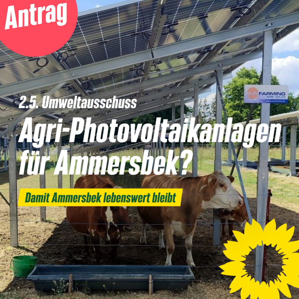 Der Umweltausschuss am 2.5. soll beschließen, sich in einer der ersten UA-Sitzungen in der neuen Legislaturperiode von jeweils einem fachlichen Referenten/Referentin über die Aspekte von Agri-PV und Freiflächen-PV informieren zu lassen und gemeinsam über Fragen und Lösungen zu Zielkonflikten zu diskutieren. Der fachliche Input soll dem Ausschuss helfen, begründete Antworten auf die Frage zu finden: Wie viele PV-Anlagen können auf Ammersbeker Äckern installiert werden, ohne dass es zu Gefahren oder Konflikten kommt?