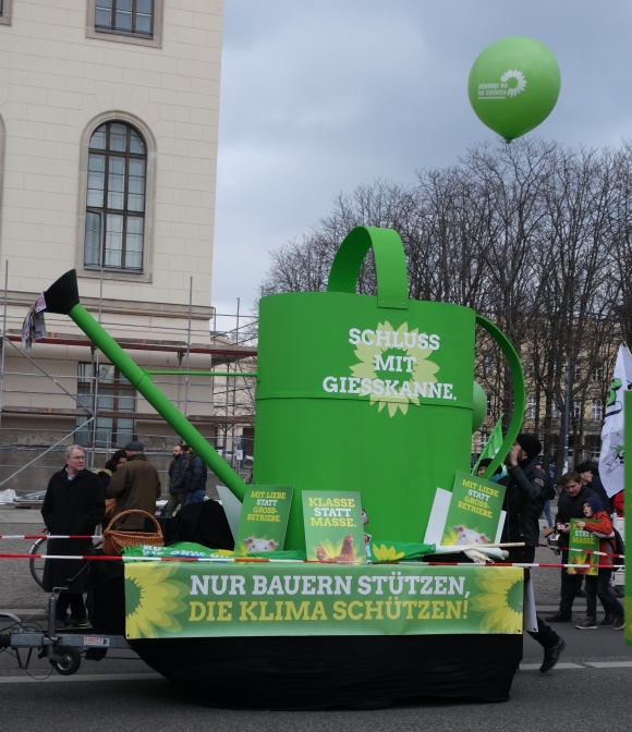 Bei 35.000 Teilnehmern an der Demo "Wir haben es satt" in Berlin war der Anteil der Fraktion der Ammersbeker Grünen, der mitmarschierte, sehr klein. Dafür war die Grüne Gießkanne, die die Bundesgrünen mit ihrem Trecker hinter sich her zogen, besonders groß. Sie stand für das Gießkannenprinzip, mit dem EU-Mittel* an landwirtschaftliche Betriebe verteilt werden. Nicht die Landwirte, die etwas für Tierschutz, Natur- und Klimaschutz tun, sondern die, die am meisten Fläche haben, bekommen das meiste Geld. Bäuerliche Familienbetriebe, darunter auch die meisten Biobauern, haben das Nachsehen.