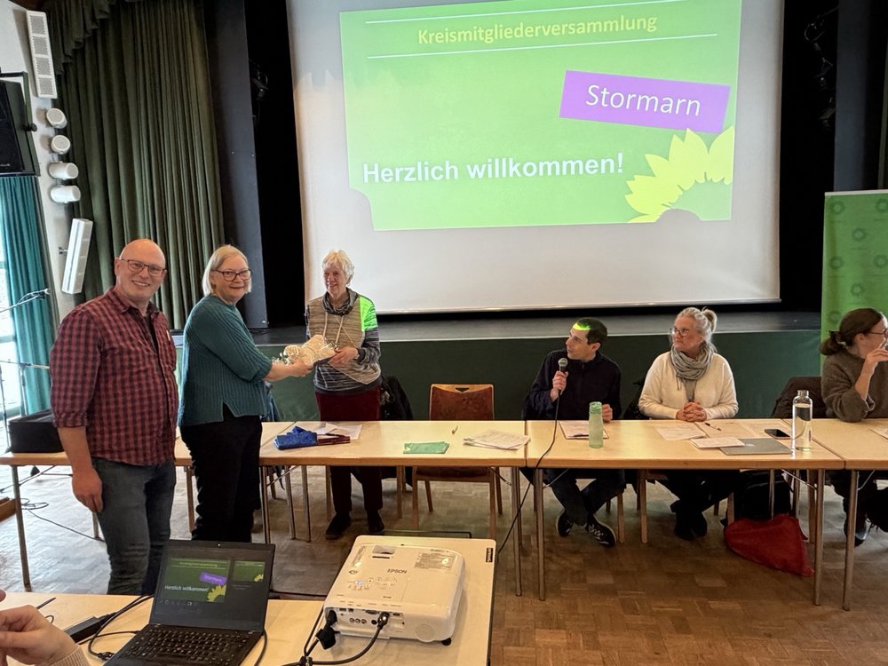 Auf der Kreismitgliederversammlung der GRÜNEN Stormarn, am 31.01.2026 im Pferdestall des DGH Ammersbek, überreichten die neugewählten Vorsitzenden, Gerd Alpers und Brigitte Richter, dem Gründungsmitglied Anne vor dem Esche ein Geschenk zum Jubiläum des Ortsverbandes.