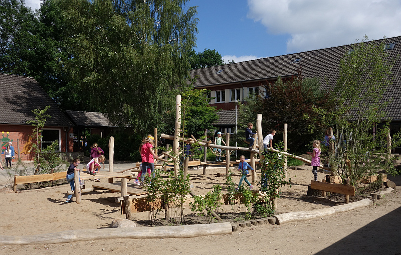 Das alte Gerüst war im Lauf der Jahre durch Regen, Sonne und Sandrieb unter den Schuhen marode geworden und daher nicht mehr tüv-zulässig. Leider hatte die Gemeinde kein Geld für ein neues Klettergerüst, vermutlich weil sie sparen muss, um die Millionen für den fragwürdigen Schulneubau auf der Grünen Wiese draußen in Bünningstedt zusammenzubekommen.