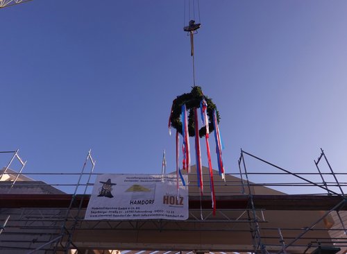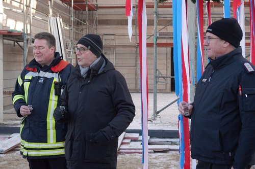 Hoch in den strahlend blauen Himmel zog am 17. Dezember 2022 der Kran die Richtkrone mit ihren blauweißroten Bändern und der Bürgermeister eröffnete das Richtfest mit den Worten: "Wir bauen hier nicht für die Feuerwehr, sondern für unsere Sicherheit." Trotzdem freuten sich natürlich besonders die Bünningstedter Feuerwehr und ihr Ortswehrführer Sven Denker über den fertigen Rohbau und Dachstuhl ihres neuen Feuergerätehauses.