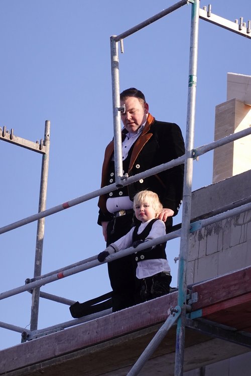 Stolz wünschte der Zimmermeister der großen Familienzimmerei aus Fahrenkrug der Feuerwehr in seinem Richtspruch, dass sie sich lang ihres Besitzes erfreuen mögen, vom Glück begleitet und vor Brandgefahr geschützt. Neben ihm stand stolz sein kleiner Sohn als Zimmermann im Kleinformat auf dem Baugerüst.
