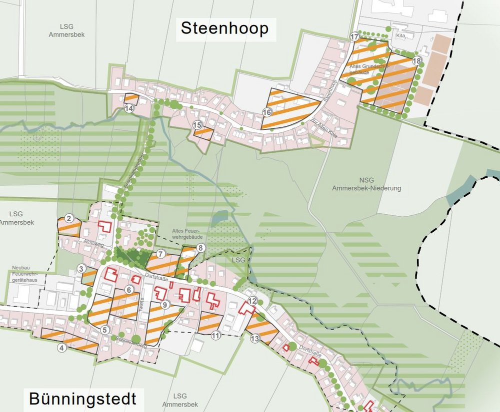 Das Konzept sieht für Bünningstedt/Steenhoop je nach Verdichtung 48 bis 83 zusätzliche Wohneinheiten vor. Ein Schwerpunkt liegt auf dem Grundschulgelände: Nach dem Umzug der Schule in einen modernen Neubau soll der alte, marode Bau von 1957/58 abgerissen werden, um Platz für acht bis 21 Wohneinheiten zu schaffen. Der Fußball-Grandplatz bleibt unberücksichtigt, da er im Außenbereich liegt.