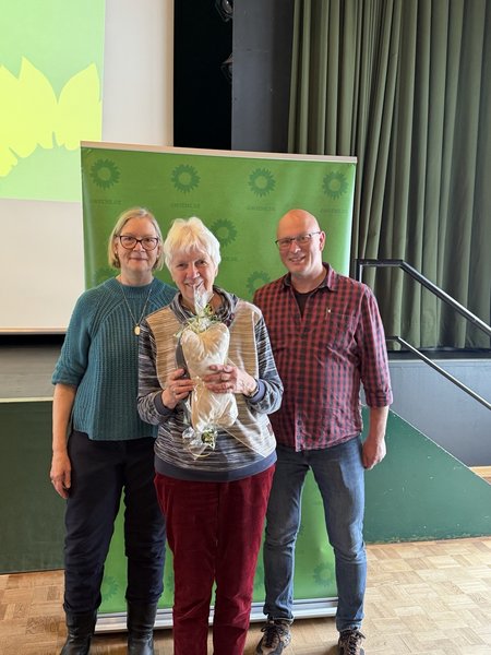 Auf der Kreismitgliederversammlung der GRÜNEN Stormarn, am 31.01.2026 im Pferdestall des DGH Ammersbek, überreichten die neugewählten Vorsitzenden, Gerd Alpers und Brigitte Richter, dem Gründungsmitglied Anne vor dem Esche ein Geschenk zum Jubiläum des Ortsverbandes.